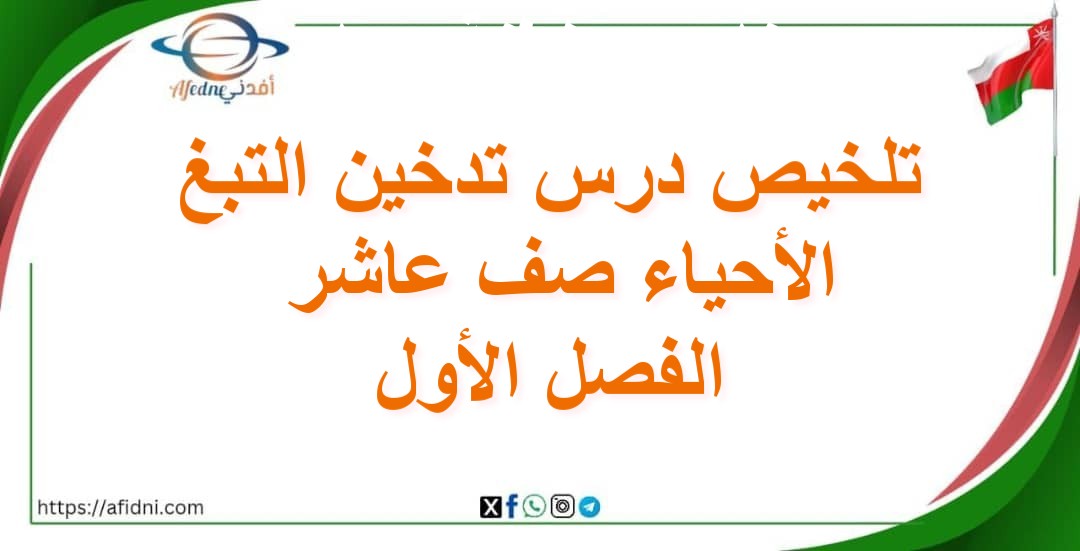 ولأننا نعلم أن العلم هو الطريق إلى التميز، وأن التعلم هو المفتاح للنجاح المستمر والمضمون، ومن أجل ضمان ذنجاحكم إليكم ملف يحتوي على تلخيص درس تدخين التبغ الأحياء صف عاشر الفصل الأول من اعدته الأستاذة كلثم محمد الهوتية، وفق منهج سلطنة عمان وحسب مقررات وزارة التربية والتعليم تقدمه لكم منصة أفدني التعليمية